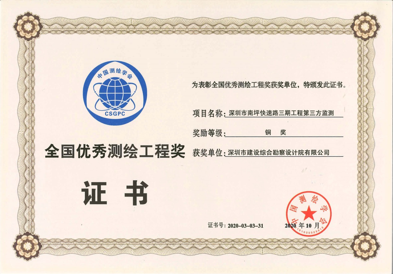 我司参选评奖项目《深圳市南坪快速路三期工程第三方监测》荣获全国优秀测绘工程奖铜奖。